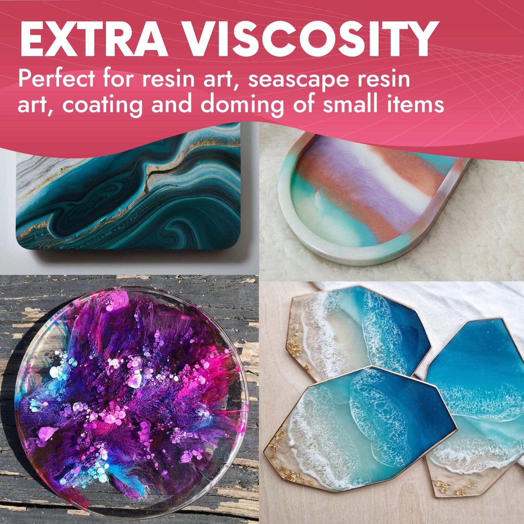 This high viscosity resin is perfect for resin art pouring, seascape resin art, coating/sealing of artworks and doming of small items. It has a working time of up to 20-30 minutes (depending on size). Recommend for professionals.
