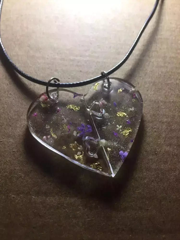 Crystal epoxy resin jewelry pendants with floral designs on gold chains.