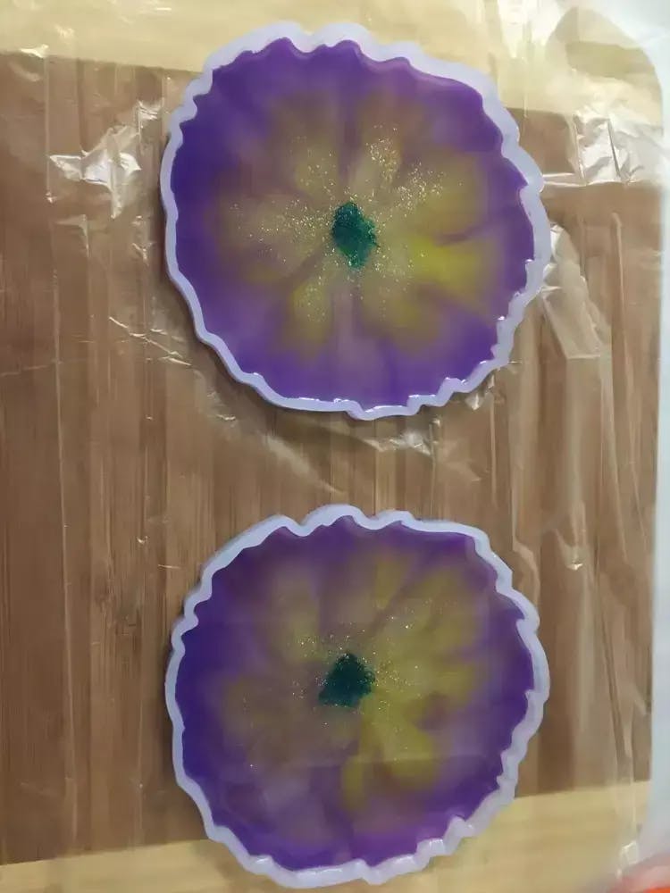 Transparent coasters made from Artline Crystal Epoxy Resin, featuring no bubbles and showcasing dried flowers embedded in the center for a delicate, natural touch
