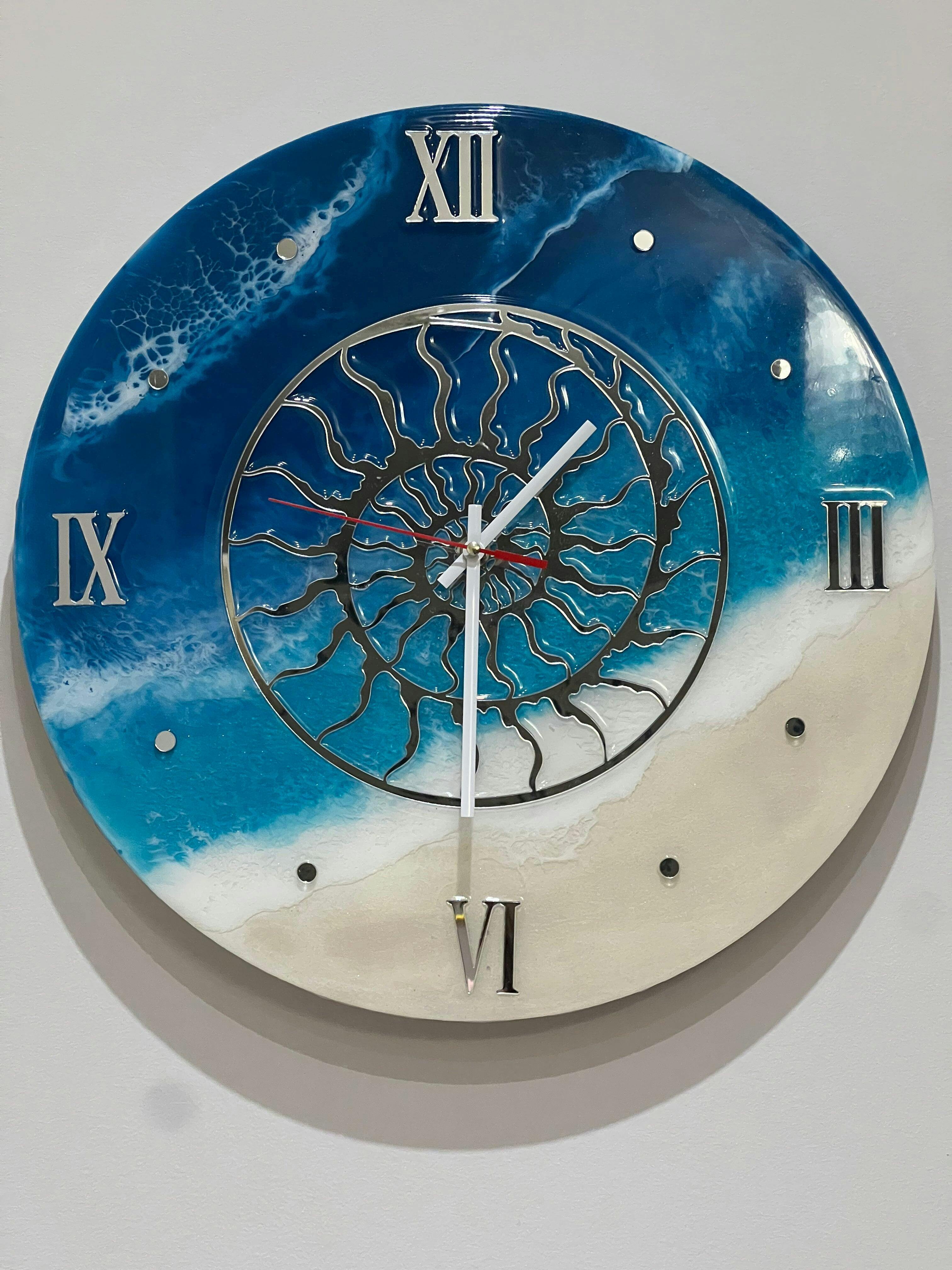 Medium viscosity epoxy resin artwork examples, showcasing clock and resin art techniques.