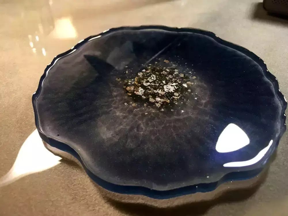 Epoxy resin art pieces showcasing sophisticated techniques, including seascape and floral designs.